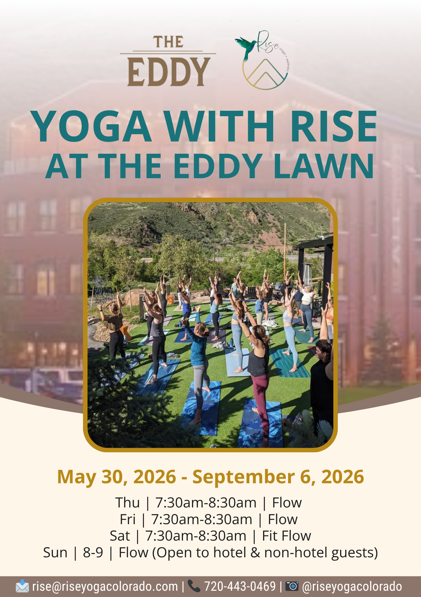 Flow with Rise Yoga & Wellness at Eddy, where movement meets the rhythm of the outdoors. This all-levels vinyasa class links breath with movement in a steady, energizing flow designed to build strength, improve mobility, and leave you feeling grounded and refreshed.